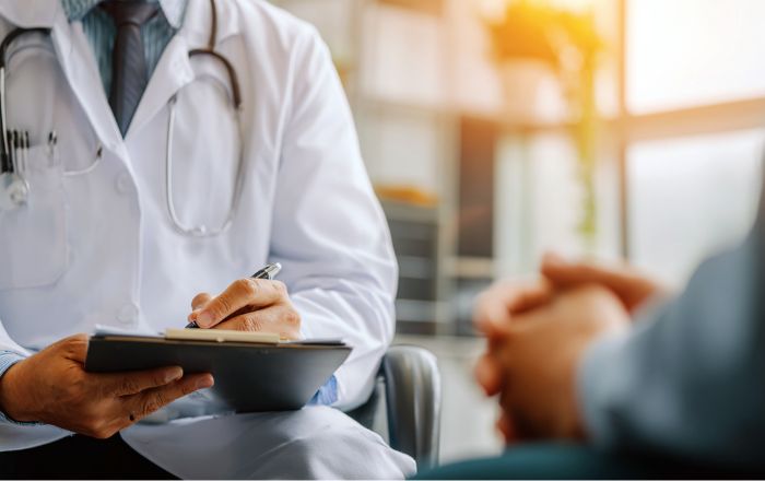 呼吸器内科で禁煙治療について医師が患者の相談を受けている診察風景